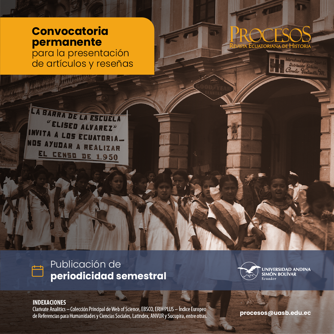 Durante todo el año Procesos. Revista Ecuatoriana de Historia recibe contribuciones (artículos y reseñas) inscritas dentro de los siguientes campos: